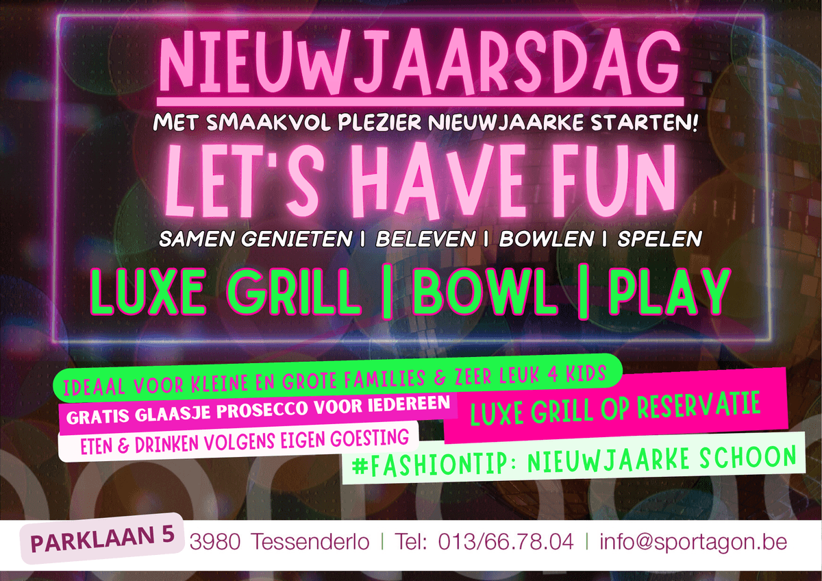 Met veel plezier den eerste van't jaar vieren! Samen beleven. Genieten. Bowlen. Eten à la carte. Eetformules. Familie- of vriendenfeestje. Fashiontip: "nieuwjaarke schoon"...