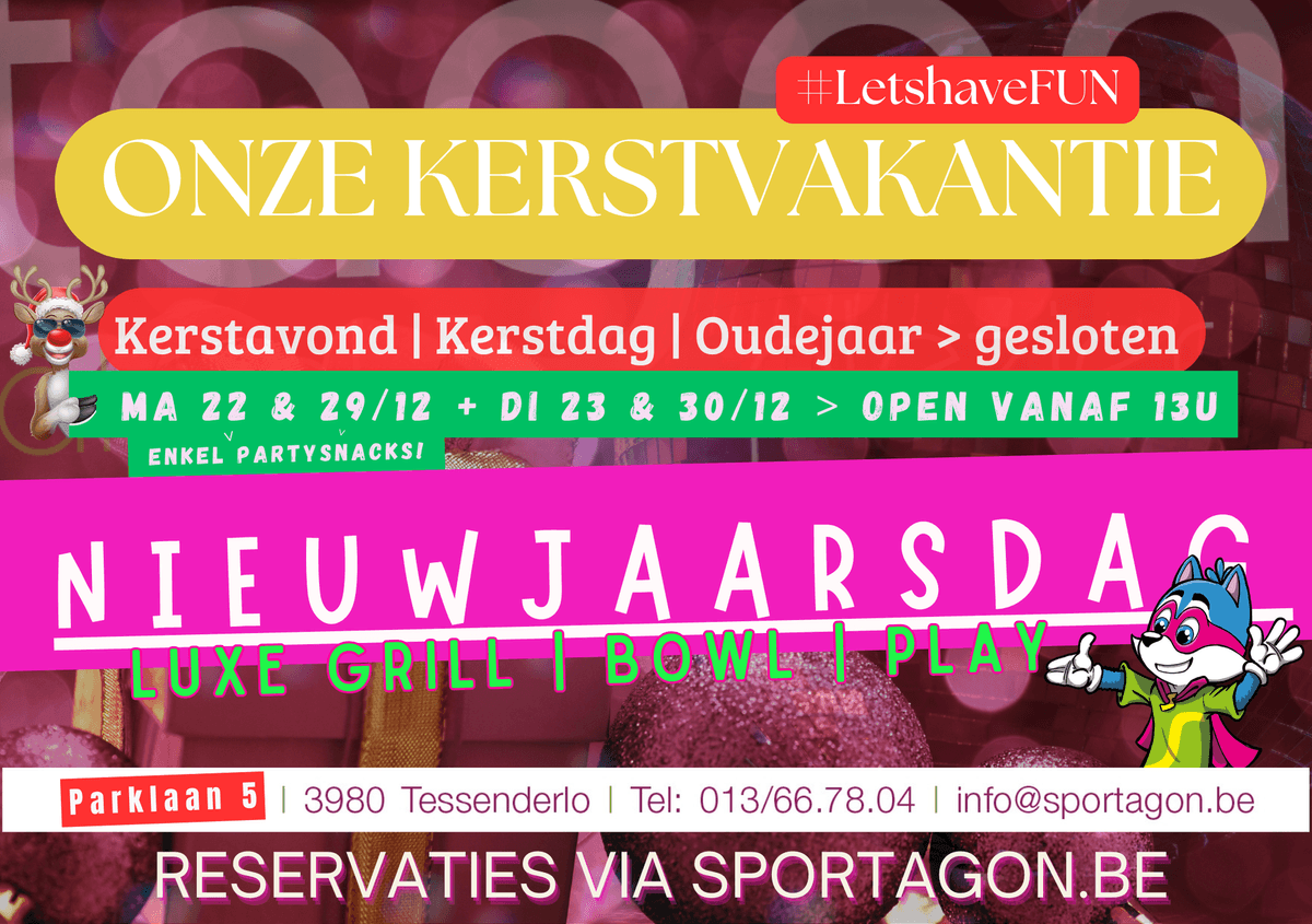 Leuk, actief, gezellig... Xmas Bowlen @ Sportagon! Kerstballen! Kerstbowlen! Kerstmuts op en bowl! Kerstfun ook voor kids oa met onze binnenspeeltuin en ons springkasteel. Hohohowelkom!